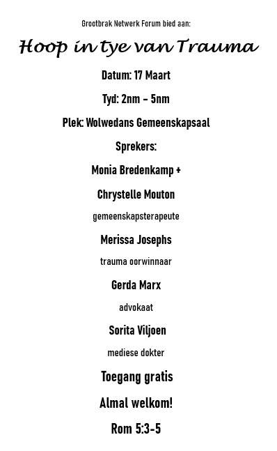- Wêreldbiddag vir vroue: Die biddag was ‘n gesellig saambid geleentheid en is deur die VGK van Groot-Brakrivier aangebied.