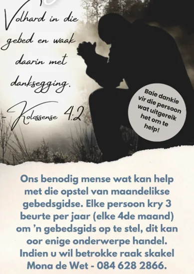 - Indien u bewus is van iemand met nood, siekte of wat eensaam is en hulp benodig kontak u kerkraadslid of die kerkkantoor.
