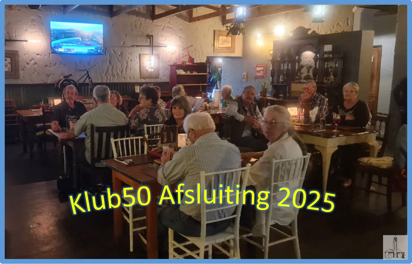 Klub50 se lede het ‘n heerlike saamkuier afsluitings funksie by Searle Village Restaurant gehou 5 November 2025. Daar is gesels, heerlike etes genuttig, En selfs vlugvoetig gedans.