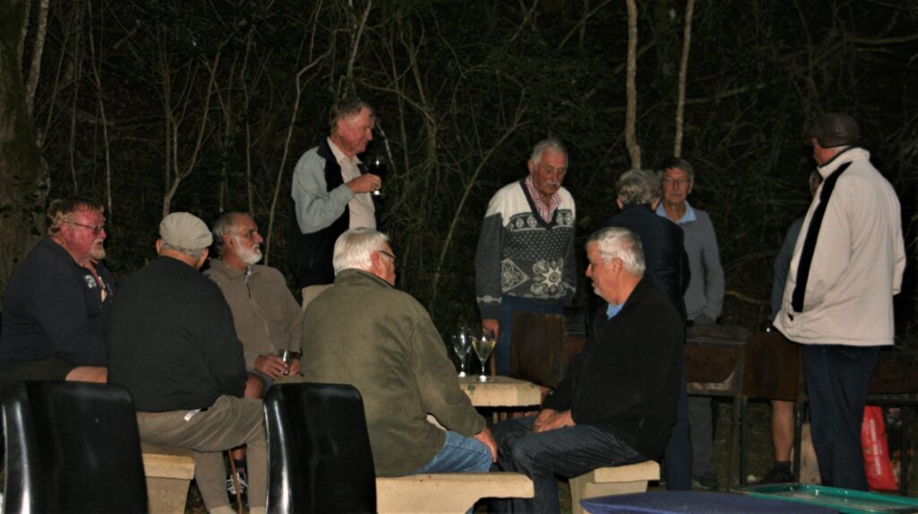 Soggens het tammeletjie bybelvasvrae onder leiding van Johan Miller asook samesang, uit die pienkboekkies, die tyd in aanloop tot die laat-ontbyt, vermaak. Saans is daar heerlik om die braaivleisvure gekuier en die heerlike kos wat die ‘span van die dag’ voorberei het, was besonders en keurig voorberei. Ons is ook vermaak met snaakse staaltjies uit verskillende oorde.