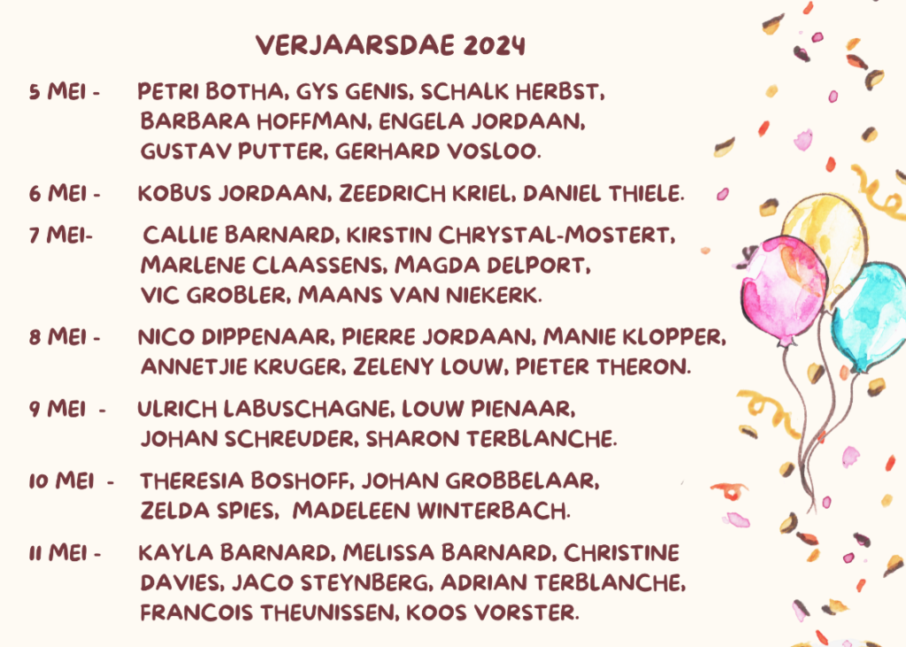 Gepubliseer op 4 Mei 20244 Mei 2024 deur NG KerkLief en Leed Week 19 van 2024 Verjaarsdae Deel hierdie op: Share on Facebook (Opens in new window) Facebook Share on WhatsApp (Opens in new window) WhatsApp More Share on X (Opens in new window) X Share on Telegram (Opens in new window) Telegram Email a link to a friend (Opens in new window) Email Verwante items