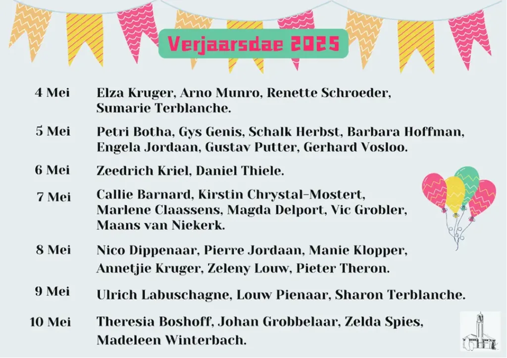 Gepubliseer op 3 Mei 20253 Mei 2025 deur NG KerkLief en Leed Week 19 van 2025 Baie geluk aan al ons verjaardag maats. Mag die Here julle ryklik seën in hierdie jaar. Deel hierdie op: Share on Facebook (Opens in new window) Facebook Share on WhatsApp (Opens in new window) WhatsApp More Share on X (Opens in new window) X Share on Telegram (Opens in new window) Telegram Email a link to a friend (Opens in new window) Email Verwante items