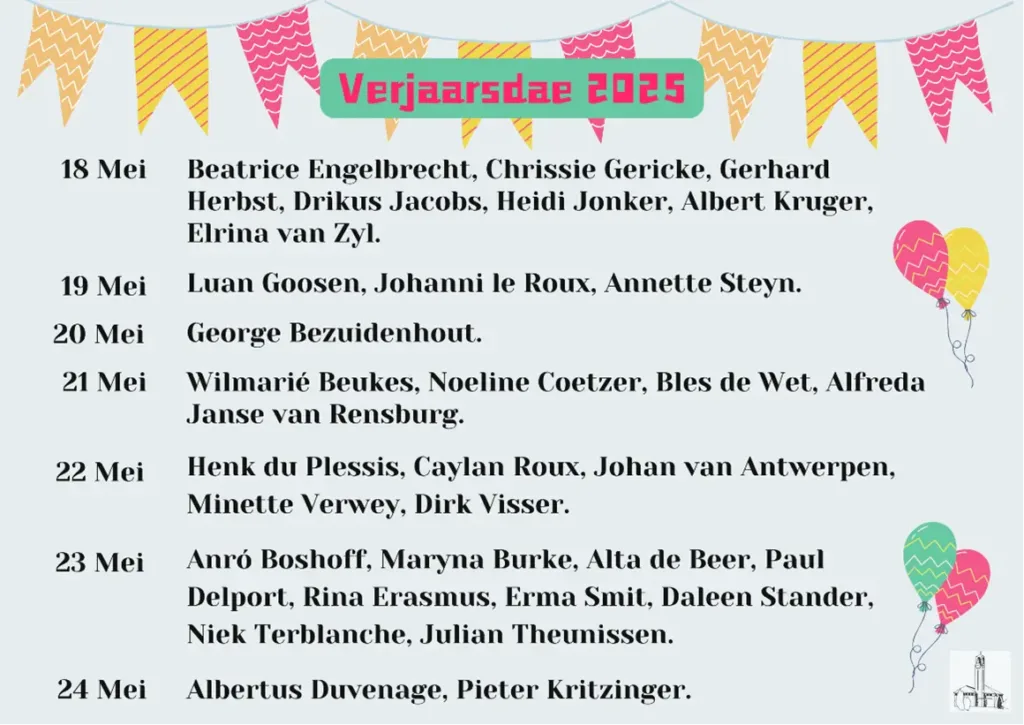 Gepubliseer op 17 Mei 202514 Mei 2025 deur NG KerkLief en Leed Week 21 van 2025 Verjaarsdae Deel hierdie op: Share on Facebook (Opens in new window) Facebook Share on WhatsApp (Opens in new window) WhatsApp More Share on X (Opens in new window) X Share on Telegram (Opens in new window) Telegram Email a link to a friend (Opens in new window) Email Verwante items