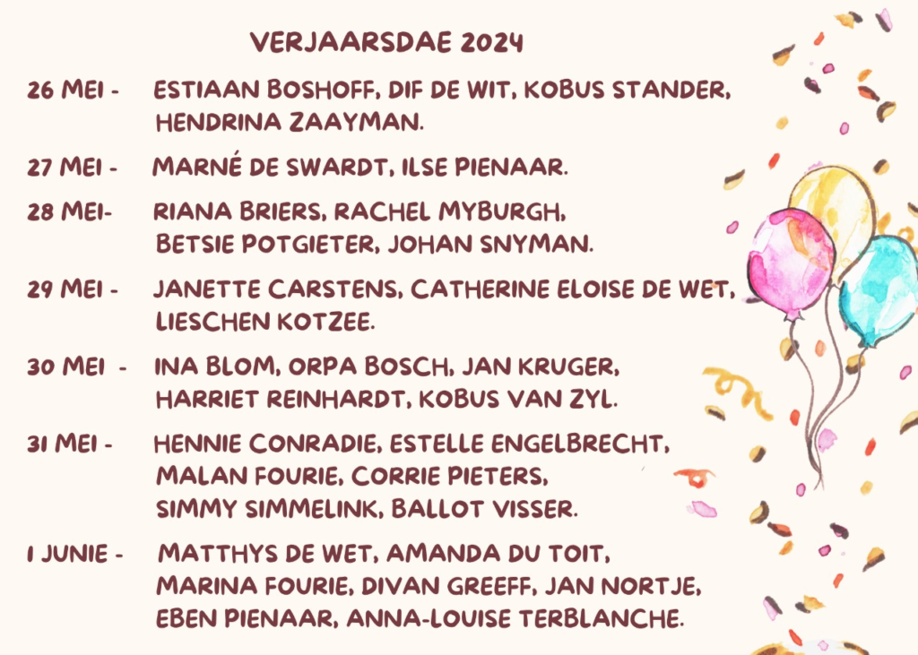 Gepubliseer op 24 Mei 202424 Mei 2024 deur NG KerkLief en Leed Week 22 van 2024 Verjaarsdae: Deel hierdie op: Share on Facebook (Opens in new window) Facebook Share on WhatsApp (Opens in new window) WhatsApp More Share on X (Opens in new window) X Share on Telegram (Opens in new window) Telegram Email a link to a friend (Opens in new window) Email Verwante items