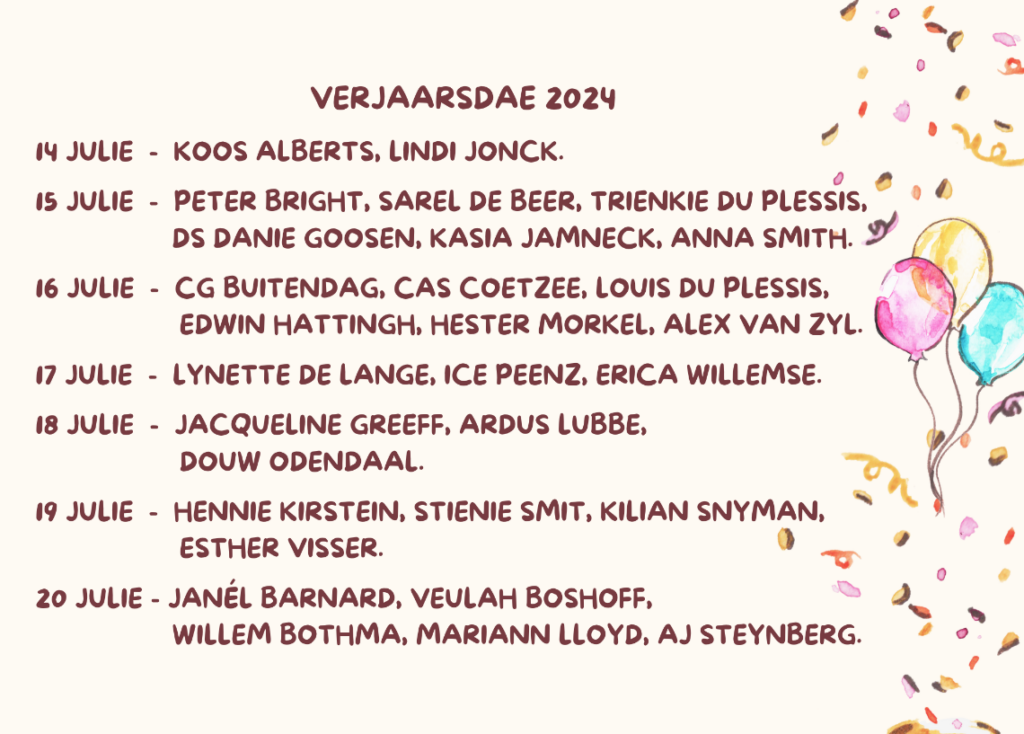 Gepubliseer op 14 Julie 202414 Julie 2024 deur NG KerkLief en Leed Week 30 van 2024 Verjaarsdae: Deel hierdie op: Share on Facebook (Opens in new window) Facebook Share on WhatsApp (Opens in new window) WhatsApp More Share on X (Opens in new window) X Share on Telegram (Opens in new window) Telegram Email a link to a friend (Opens in new window) Email Verwante items