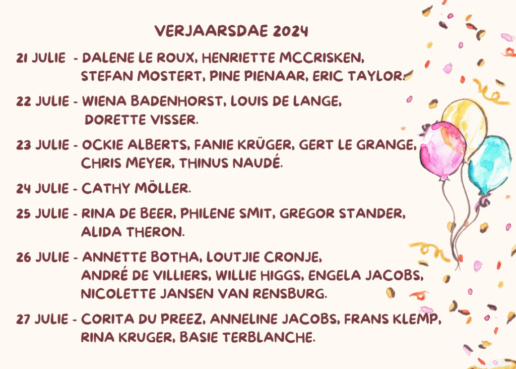 Gepubliseer op 22 Julie 202422 Julie 2024 deur NG KerkLief en Leed Week 31 van 2024 Verjaarsdae: Deel hierdie op: Share on Facebook (Opens in new window) Facebook Share on WhatsApp (Opens in new window) WhatsApp More Share on X (Opens in new window) X Share on Telegram (Opens in new window) Telegram Email a link to a friend (Opens in new window) Email Verwante items