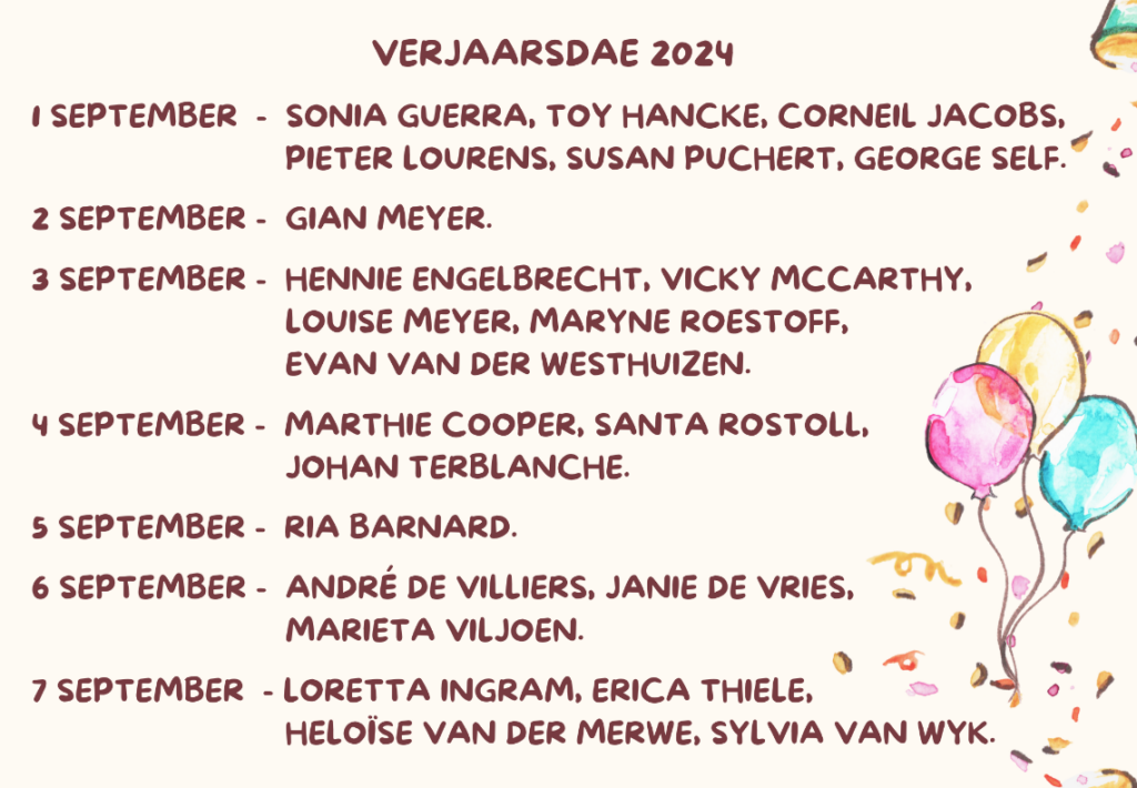Ons innige meegevoel aan die familie en vriende van 19 Augustus – Rika van der Hoven: Wyk 12A en 21 Augustus – Rossouw van der Hoven: Wyk 12A. Mag God julle vertroos in hierdie moeilike tyd.