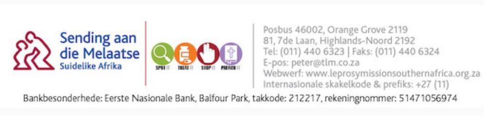 | Beste Vriende Melaatsheid beroof mense van hul vingers, vriende en vooruitsigte. Met u bystand bring die Sending aan die Melaatse hierdie rower agter tralies. Soos meeste rowers, vermom melaatsheid sy aanvalle. Dit is die Sending aan die Melaatse se taak om hom te ontmasker. Indien iemand hom raaksien, kan ons hom gevange neem, voordat hy met ‘n misdaadveldtog begin. Ons het dit reggekry om melaatsheid se masker af te pluk in hierdie video. Met u hulp kan ons melaatsheid raaksien, dit behandel en die siekte in sy spore stuit. Melaatsheid stop? Dis nou goeie nuus! “Maak siekes gesond, wek dooies op, reinig melaatses en dryf duiwels uit. Julle het dit verniet ontvang, gee dit ook verniet.” Matteus 10:8 Jesus het ons opdrag gegee om hierdie werk te doen en dis nog lank nie klaar nie. U kan verhoed dat melaatsheid nog ‘n persoon se hande, voete en sig beroof deur hierdie skakel so wyd as moontlik te versprei. Met opregte dank vir u hulp om melaatsheid te ontmasker. Pieter Laubscher Uitvoerende Direkteur Sending aan die Melaatse Suidelike Afrika 073 470 3185 NS: Deel asseblief hierdie video met lidmate van u gemeente of by u selgroepe of gebedsgeleenthede. Indien u ‘n webtuiste het, plaas gerus die skakel na die video op die tuisblad. Versoek asseblief u vriende om hierdie video wyd en syd te deel. Hoe meer mense help om hierdie rower te ontmasker, hoe beter! Besoek ons webwerf deur hier te kliek. |