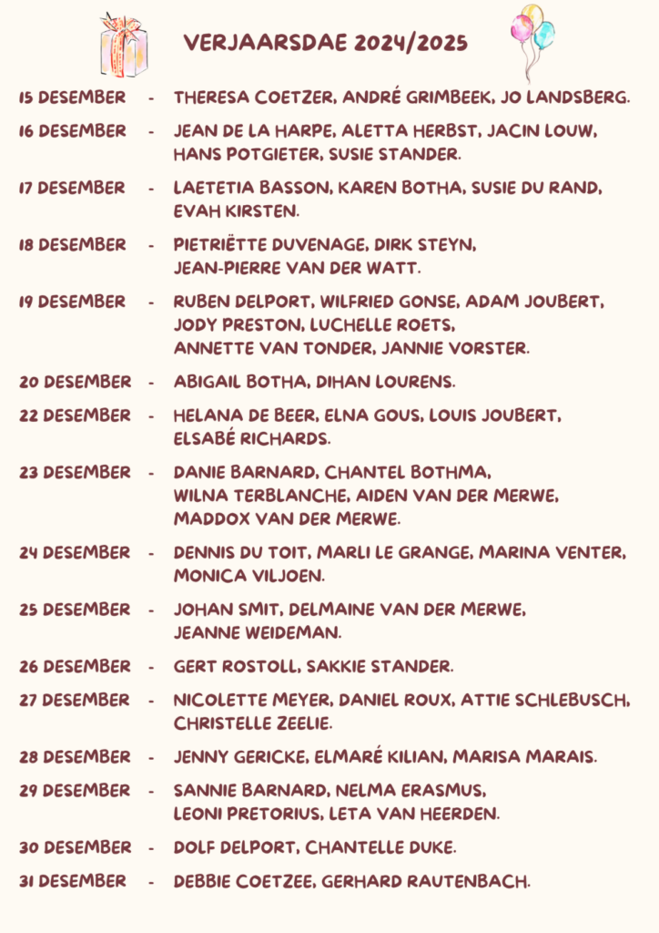 - Enige persoon wat graag by die Omgeebediening betrokke wil raak skakel asseblief vir Corrie Pieters – 082 327 9527.