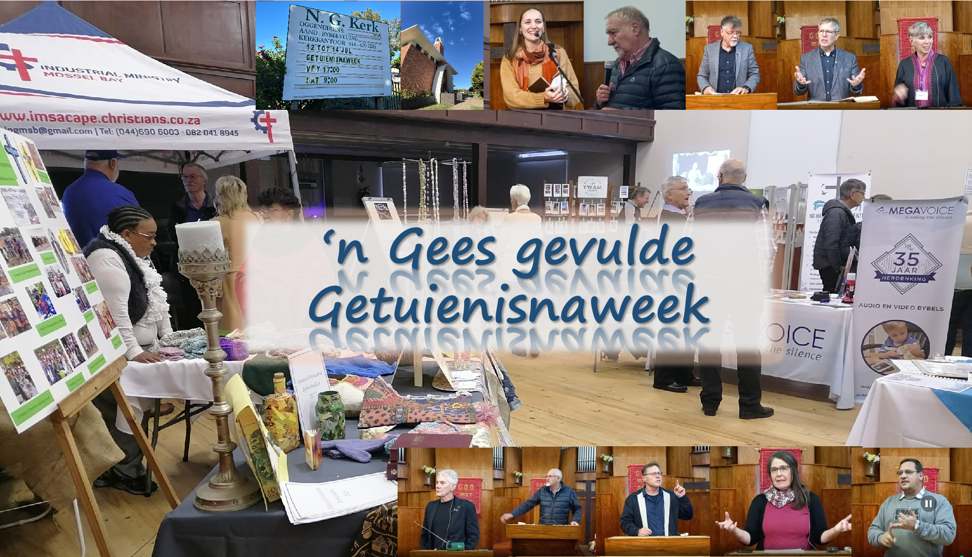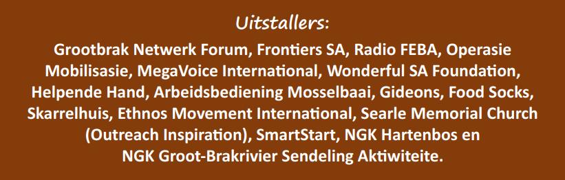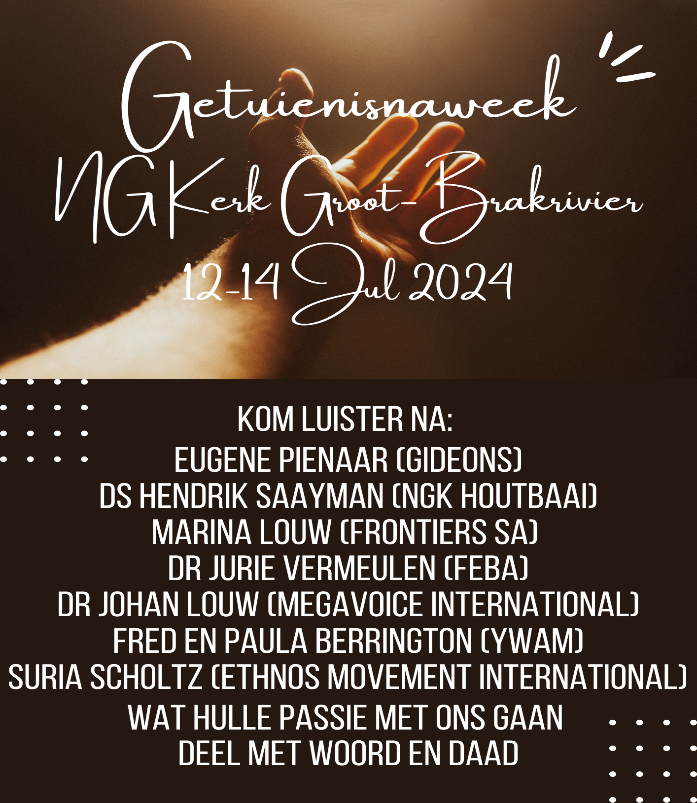 Programleier: Dr Frans Hancke Vrydag 12 Julie 2024 17h00 – 18h00: Besigtiging van uitstallings in kerksaal 18h00 – 18h10: Verwelkoming deur Ds Charné Viljoen in kerkgebou 18h15 – 18h40: Eugene Pienaar van die Gideons in kerkgebou 18h45 – 19h30: Ds Hendrik Saayman van NGK Houtbaai in kerkgebou 19h30: Kuier rondom sop en broodjies in kerksaal Saterdag 13 Julie 2024 09h00 – 09h30: Besigtiging en toeligting van uitstallings in kerksaal 09h30 – 10h00: Opening en Pietman Davids in kerkgebou 10h00 – 10h40: Marina Louw van Frontiers SA in kerkgebou 10h45 – 11h15: Dr Jurie Vermeulen van Radio FEBA in kerkgebou 11h20 – 11h50: Dr Johan Louw van MegaVoice International in kerkgebou 11h50 – 12h10: Pouse : Besoek 1 uitstallingstasie van jou eie keuse 12h15 – 12h45: 12h50 – 13h30: Suria Scholtz van Ethnos International in kerkgebou 13h30: Verversings en besig ging/gesprekvoering met gassprekers en uitstallers Sondag 14 Julie 10h00 – 10h40: Afsluiting van Getuienisnaweek deur Ds Hendrik Saayman in kerkgebou 10h40 – 11h00: Nagmaal deur Ds Charné Viljoen in kerkgebou 11h00: Tee/koffie en verversings in kerksaal Sondag na die kuiergeleentheid kan die uitstallings, wat Vrydag opgestel was, verwyder word Enige donasies is welkom en kan by NGK Groot-Brakrivier inbetaal word. (FNB rekening nr 53083186511, tak: 210314).Verwysing: Getuienisnaweek.