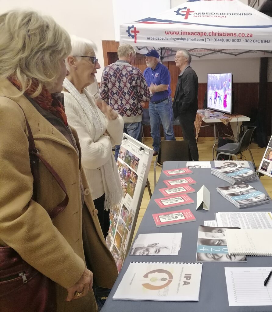 Sendingaksie uitstallings was deurgaans deur die naweek beman in die Kerksaal, vir enige navrae, of vir mense wat meer inligting wou kry, of aktief wou betrokke raak. Die Uitstallings het ingesluit: Grootbrak Netwerk Forum, Frontiers SA, Radio FEBA, Operasie Mobilisasie, MegaVoice International, Wonderful SA Foundation, Helpende Hand, Arbeidsbediening Mosselbaai, Gideons, Food Socks, Skarrelhuis, Ethnos Movement International, Searle Memorial Church (Outreach Inspiration), NGK Hartenbos en NGK Groot-Brakrivier Sendeling Aktiwiteite. Die instansies dek ‘n verskeidenheid van aksies lokaal en internasionaal, en het ‘n wonderlike oorsig gegee van die werk van mense wat geroepe gevoel het om ‘n verskil te maak.