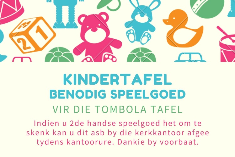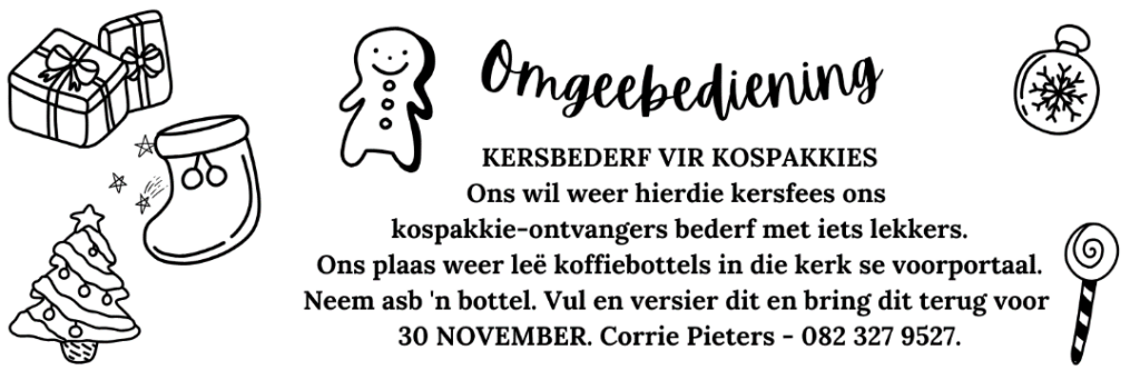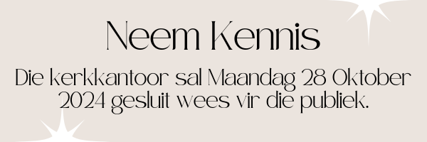 - Kooroefening by die orrel om 16:45. Marida – 082 471 0751. Alle belangstellendes welkom.