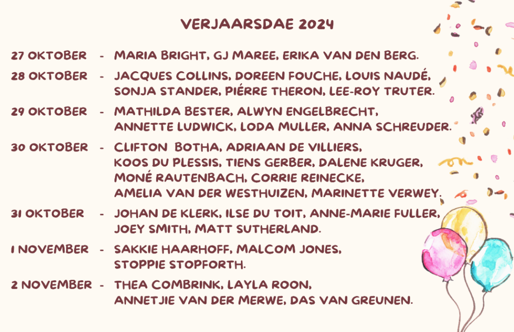 7 Oktober – Pierre van Jaarsveld: Wyk 9B. Ons innige meegevoel aan sy familie & vriende.