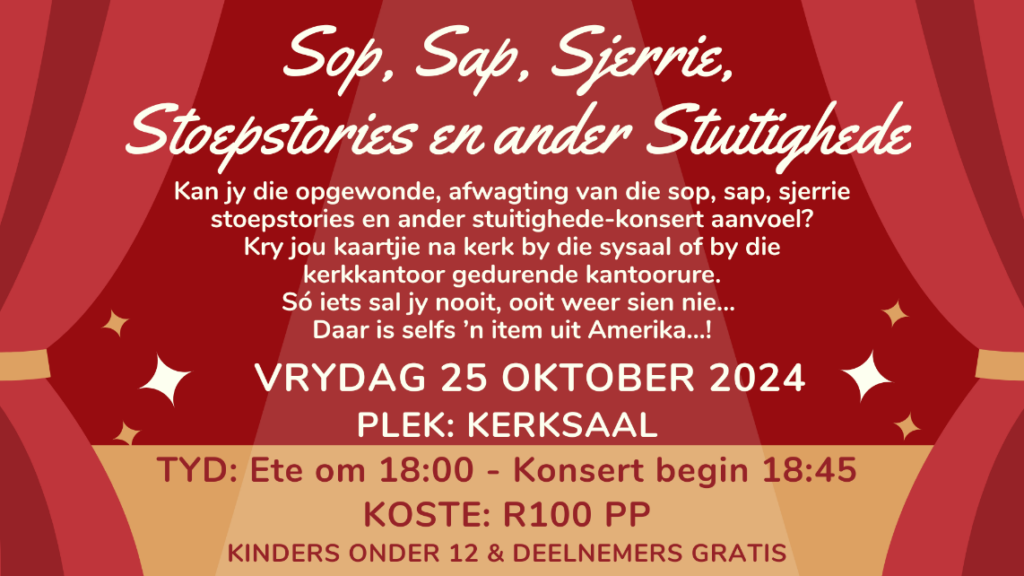 Vrydag 25 Oktober 2024 : Sop Sjerrie en Sap 18:00 Konsert 18:45