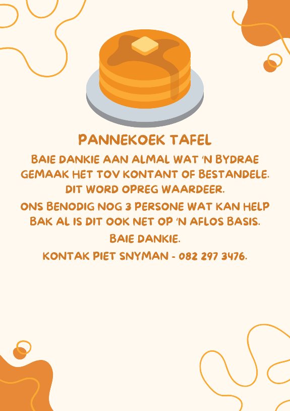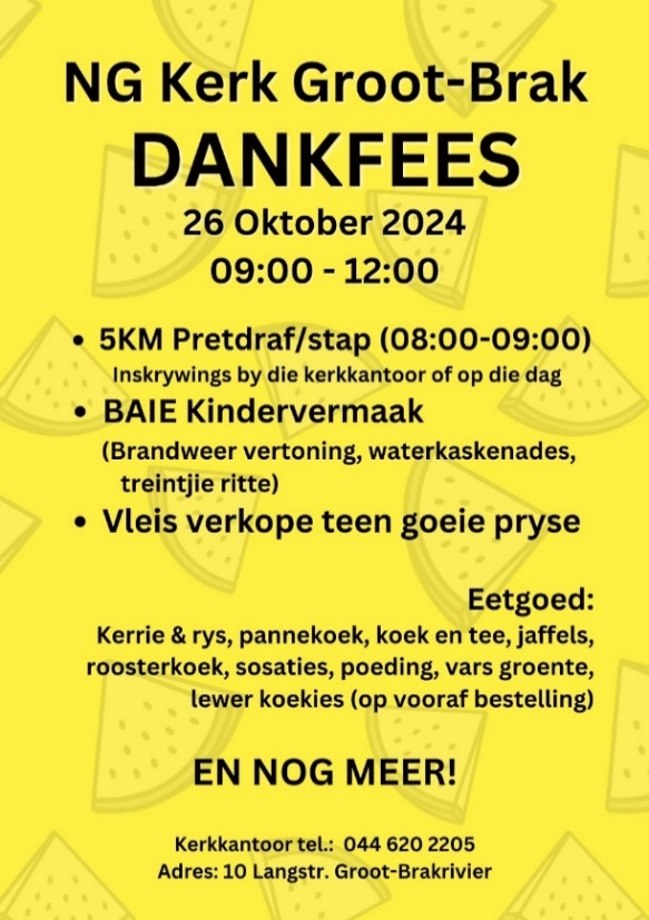 Saterdag 26 Oktober 2024: Dankfees vanaf 09:00 – 12:00. Pretdraf van 08:00.