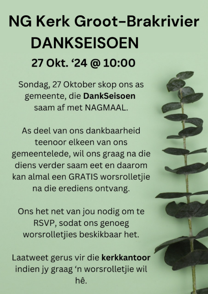 • Worsbroodjies word bedien na afloop van die erediens (vir die wat RSVP het).