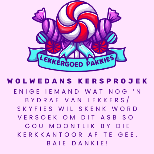 Wolwedans boodskap, sop en brood: 16 & 30 Okt, 13 & 26 Nov & 11 Des