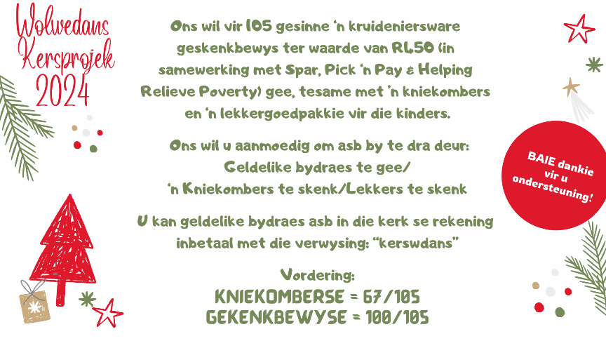 • Baie welkom by die erediens en ’n spesiale verwelkoming aan die familie en vriende van die doop ouers: Albert & Claudia Bright (dogtertjie – Ava).