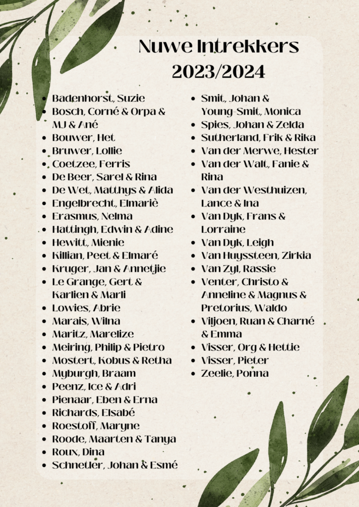 - Baie welkom by die erediens gelei deur ds Danie Goosen en ’n spesiale verwelkoming aan die familie en vriende van die doop ouers: Johan & Monique Pieters (dogtertjie – Diamé Pieters).