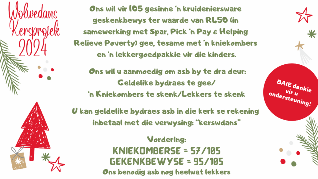 Ons nooi die gemeente om deel te neem aan ons projek – om 2 liter sop, ‘n brood en ‘n bemoedigende boodskap te voorsien aan 100 gesinne elke 2de week. Die datums vir die vierde kwartaal is 2, 16 & 30 Okt, 13 & 26 Nov & 11 Des. Ons gaan die die nuwe jaar DV op 15 Januarie 2025 begin. By voorbaat baie dankie vir u ondersteuning.
