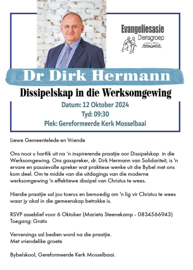 Lees meer “Erediens: Ons erfenis? 6 Oktober 2024. Psalm 16. NG Kerk Groot-Brakrivier”Prediker: Ds. Danie Goosen
