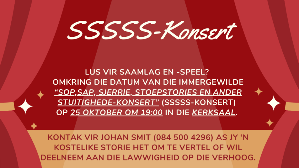 Die fees is afgeskop meet ‘n gesellige SSSSS (sop, sap, sjerrie, stoepstories en ander stuitighede) Konsert, onder leiding van Johan Smit en geopen deur Hynn Engelbrecht, in die kerksaal. Die verskeidenheid van items en grapperige stories en oorhoofse projeksies, was goed ontvang. Dit was lekker om ander talente, as wat mens gewoonlik sien, hier tot uiting te sien kom. Die konsert se laaste item was wonderlike getuienis van die bekende Desire Gardner, wat vertel het hoe sy as jong kind deur geloofs genesing gesond geword het, en sy het ons ook gewaarsku om tog nooit ‘n eier in die mikrogolf gaar te maak nie. Dit was ‘n gesellige saamkuier, om nie te mis volgende jaar nie.